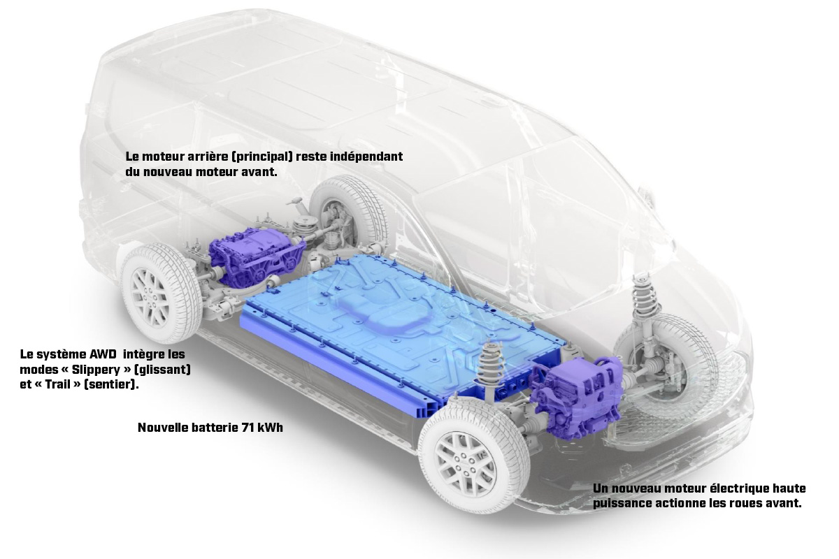 Les E-Transit Custom AWD ne sont pas plus puissants que les versions 2WD, on reste avec trois propositions connues : 136, 218 ou 286 ch… Par contre, en mode AWD, le couple peut atteindre 630 Nm (contre 415 Nm en version 2 roues motrices).